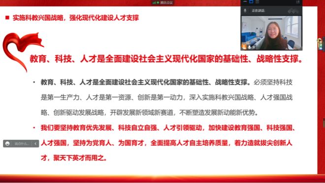 最后,支部书记朱杰君带领全体参会党员学习了党的二十大精神,重点学习习近平总书记在报告中对人才、教育、科技的重要论述,她指出党员老师们要不忘自己的初心,做好教书育人的本职工作,努力推动本科教育和人才培养高质量发展。