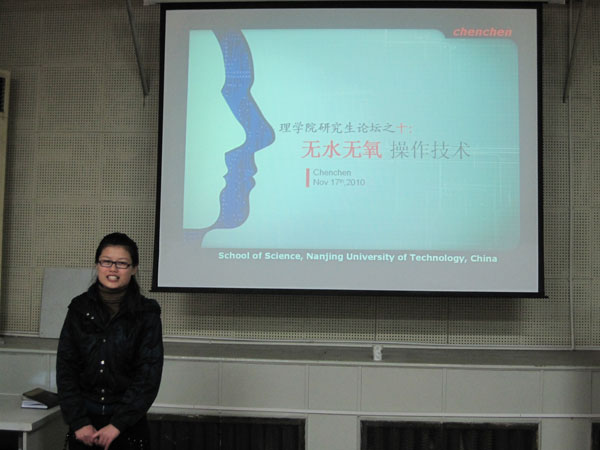 2010年11月17日下午3点,理学院研究生讲坛在丁家桥教学楼113室成功举办,本次讲坛邀请到了公司陈琛博士做了题为“有机实验中无水、无氧实验操作”的讲座。
