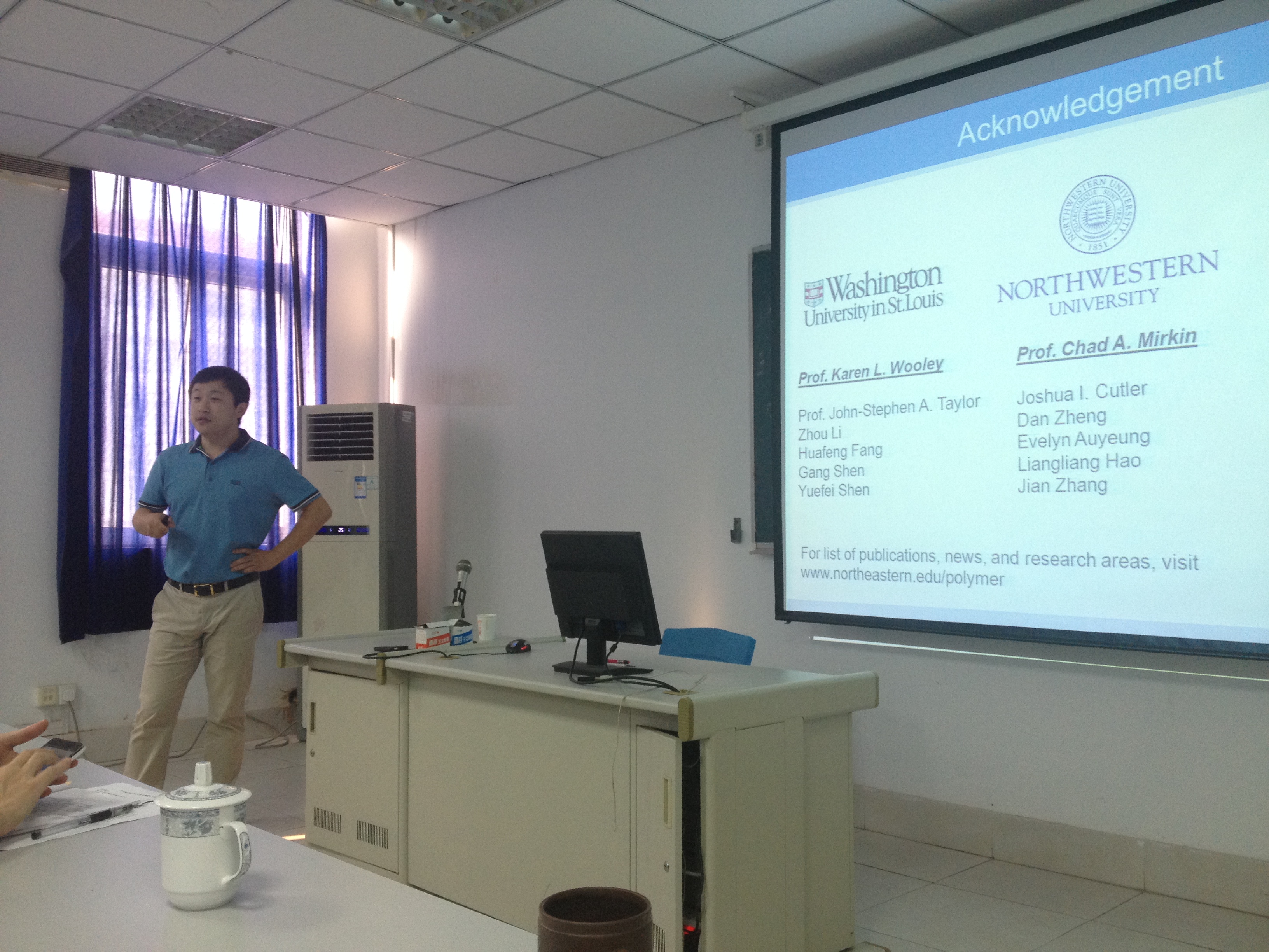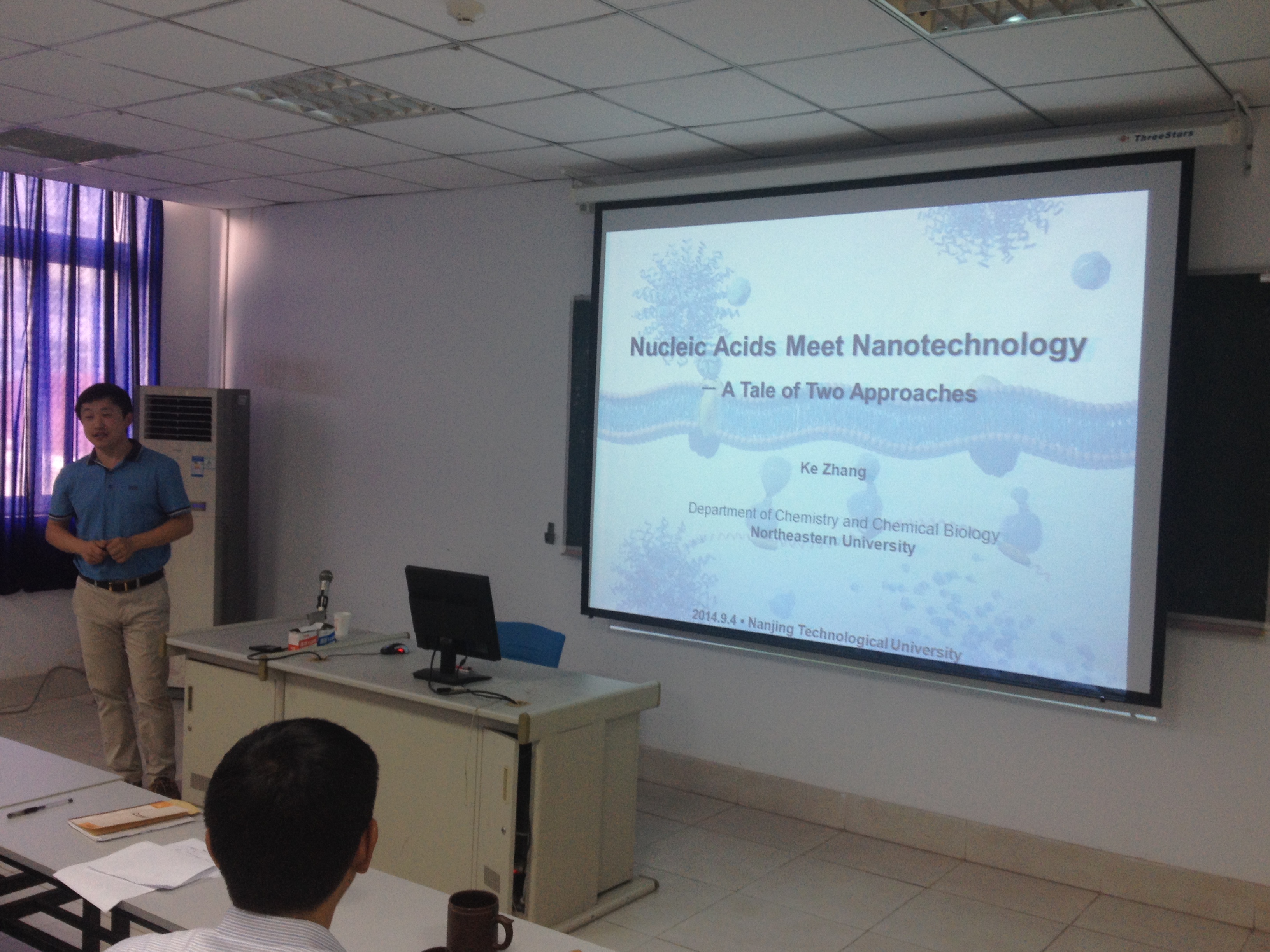 阅读次数: 发布时间:2014-09-12 更新时间:2018-12-07 在江浦校区笃行楼316报告厅,张可教授作了题为Nucleic Acid Meet Nanotechnology-- A tale of two approaches的报告。近年来,随着科技工作者不断的努力和创新,利用核酸作为治疗材料这一手段正在成为现实。张教授主要介绍了近年来其课题组专注于发展的两个不同的运送遗传物质到细胞的方法。第一种方法包括丙烯酸纳米粒子,称为cSCK纳米颗粒,作为载体携带遗传物质进入细胞。cSCKs被证明能高效地运送DNA、PNA以及siRNA进入细胞。第二种方法涉及Polymer-free DNA self-delivery系统。该系统几乎完全是由核酸的化学交联,并通过一种新型gold-catalyzed交联的策略,使颗粒能够不使用任何聚合物载体而通过调节基因表达进入细胞。