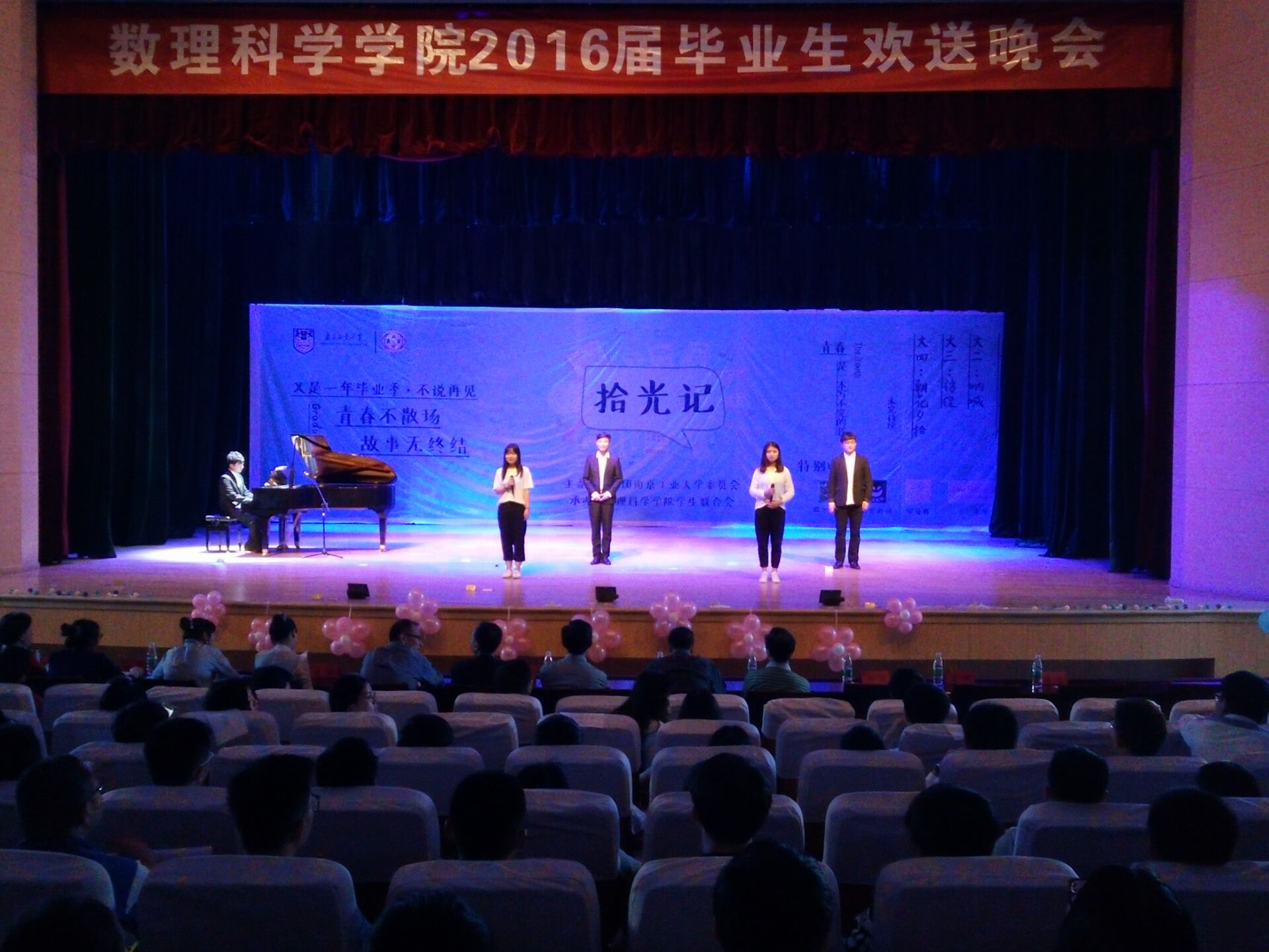最后,72779太阳集团经理沈临江老师对毕业生们深情寄语,他叮嘱同学们天道酬勤,勤能补拙;地道酬实,实能补弱;人道酬德,德能补寡,同时祝福毕业生们奋发有为,前程似锦!沈经理风趣诙谐的语言给大家上了精彩的人生一课。赢得了同学们的欢呼和掌声。整场晚会层层递进,或高昂或低沉,或诙谐或深情,把对已逝的感伤、未来的憧憬全部糅合在当下的狂欢中。 走吧,带着记忆里的梧桐叶落,玉兰花开。走吧,我们已长大,要记得一起追梦的年华。——相逢,后会有期。2016届数理学子将铭记母校和师长的培育和教诲,创造自己的锦绣前程,永远做有梦想的南工人!