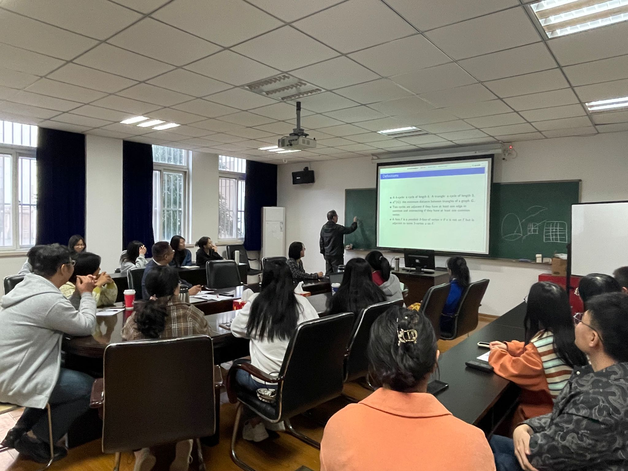 本次论坛邀请了华中师范大学数学与统计学院李相文教授做了题目为“Every planar graph without 5-cycles and adjacent 3-cycles is (2, 0, 0)-colorable”的报告。李教授在报告中首先介绍了平面图可染色性的最新研究进展,进而,又对任意无5-圈和相邻3-圈的平面图的可染色性进行了详细的阐述。