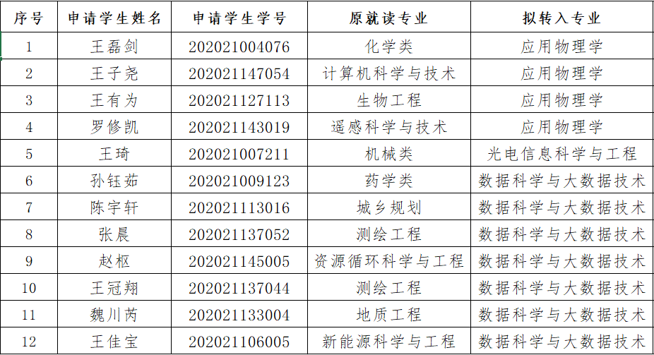 阅读次数: 发布时间:2021-07-01 更新时间:2021-07-01根据《关于开展2021年本科生转专业工作的通知》要求,经过员工报名、初审和学院转专业工作小组的考核及表决,72779太阳集团拟定2021年应用物理学、光电信息科学与工程、数据科学与大数据技术专业等3个专业的本科生转专业拟接收名单,现予以公示。公示期:2021年7月1日-7月5日,如有异议,请于2021年7月5日16:00前向72779太阳集团反映,联系电话:58139528。教务处监督电话:58139191。