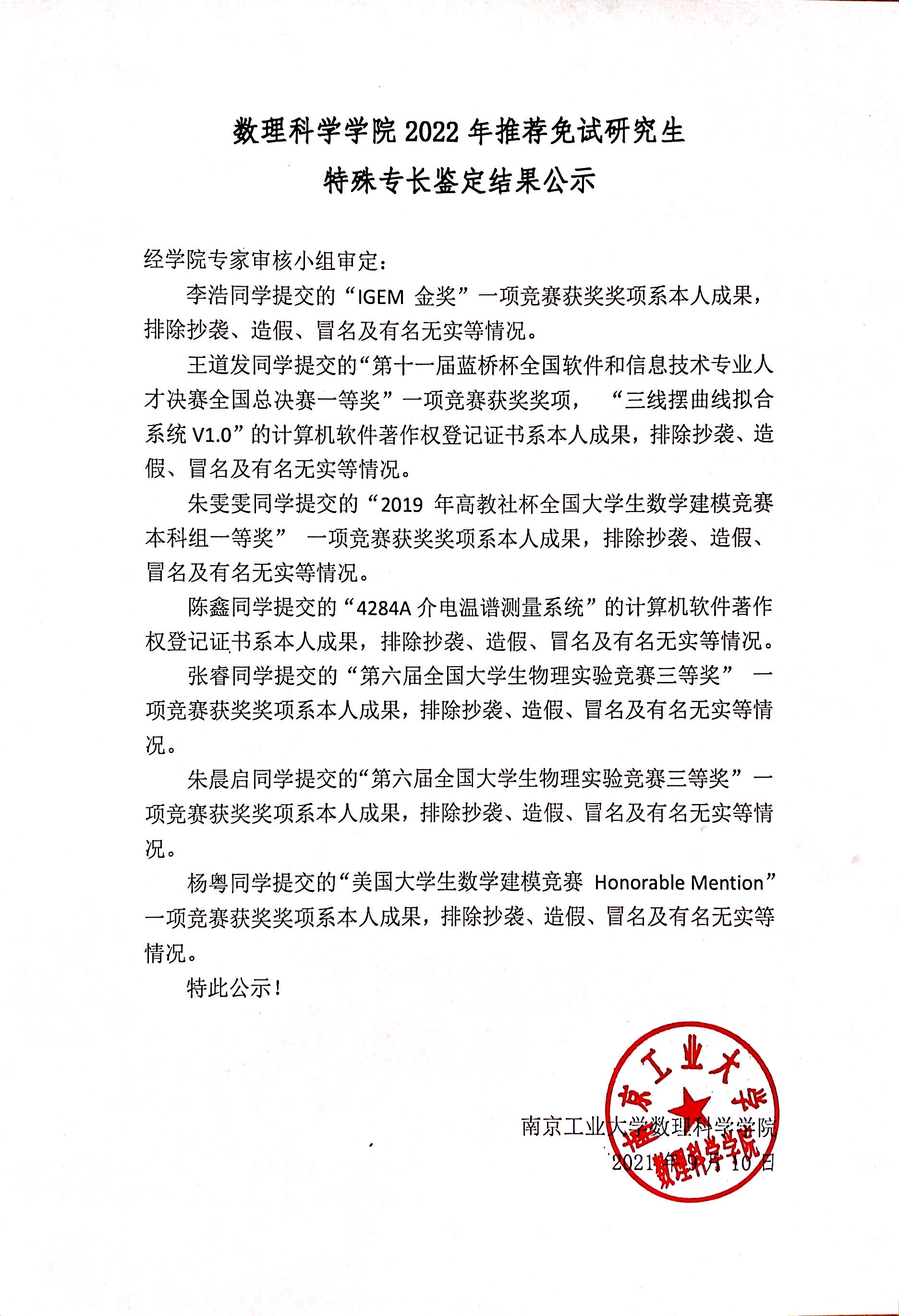72779太阳集团关于2022年推荐免试研究生特殊专长鉴定结果的公示