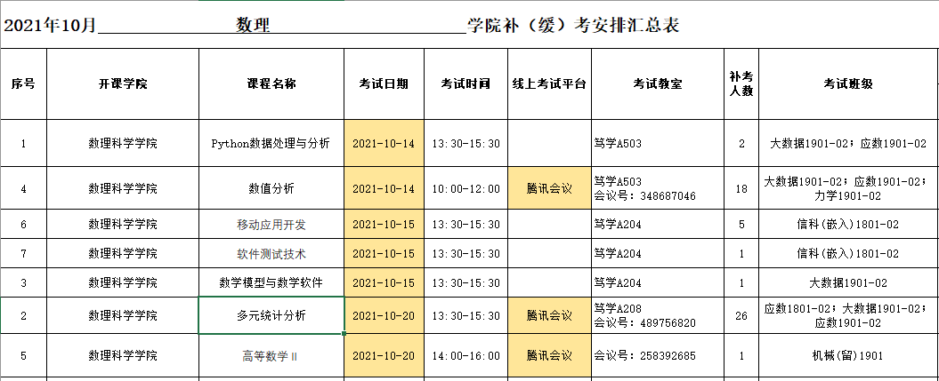 2021年10月补考数理学院数学系自排考试课程考试时间和地点通知