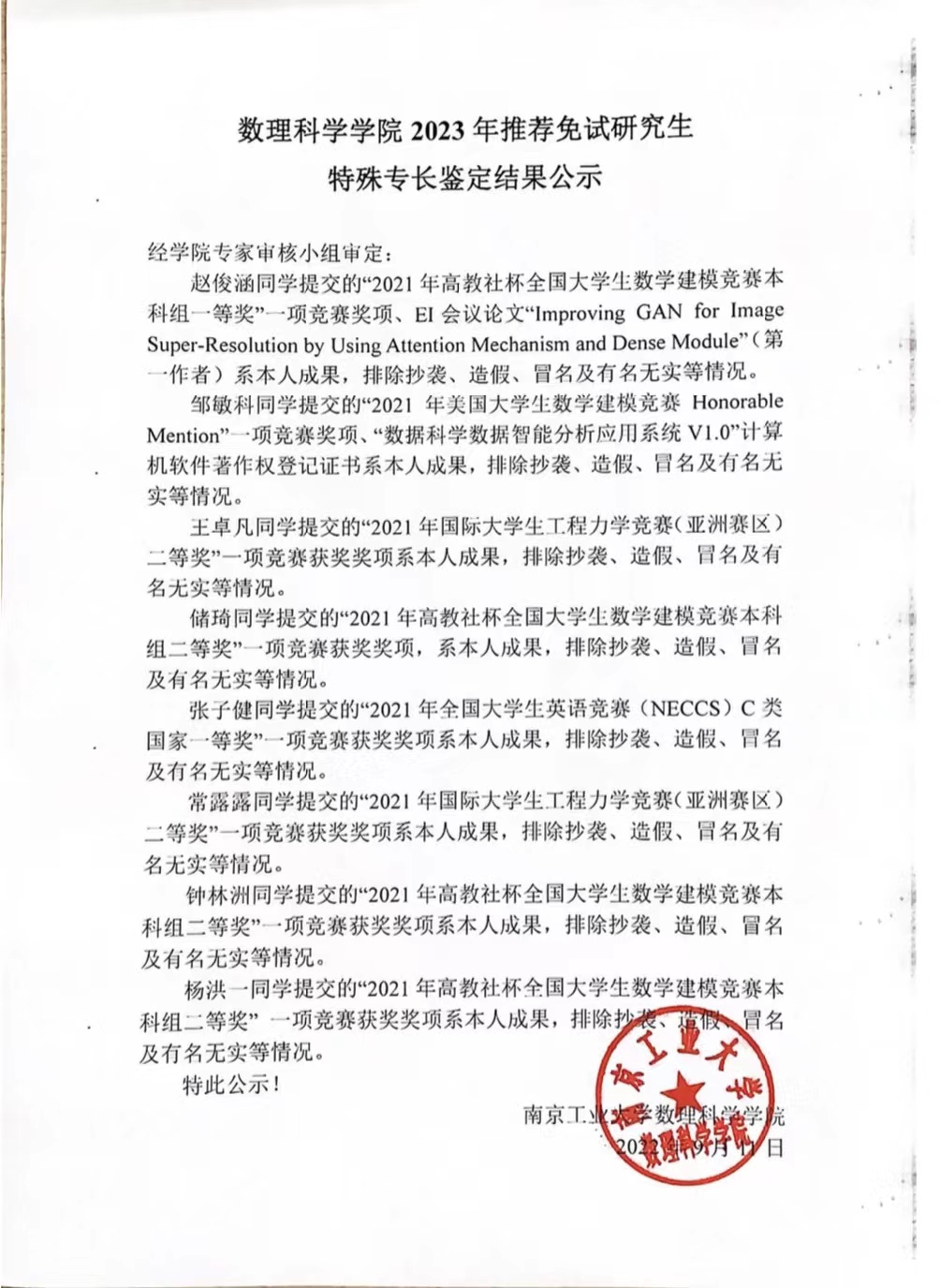 72779太阳集团2023年推荐免试研究生特殊专长鉴定结果公示