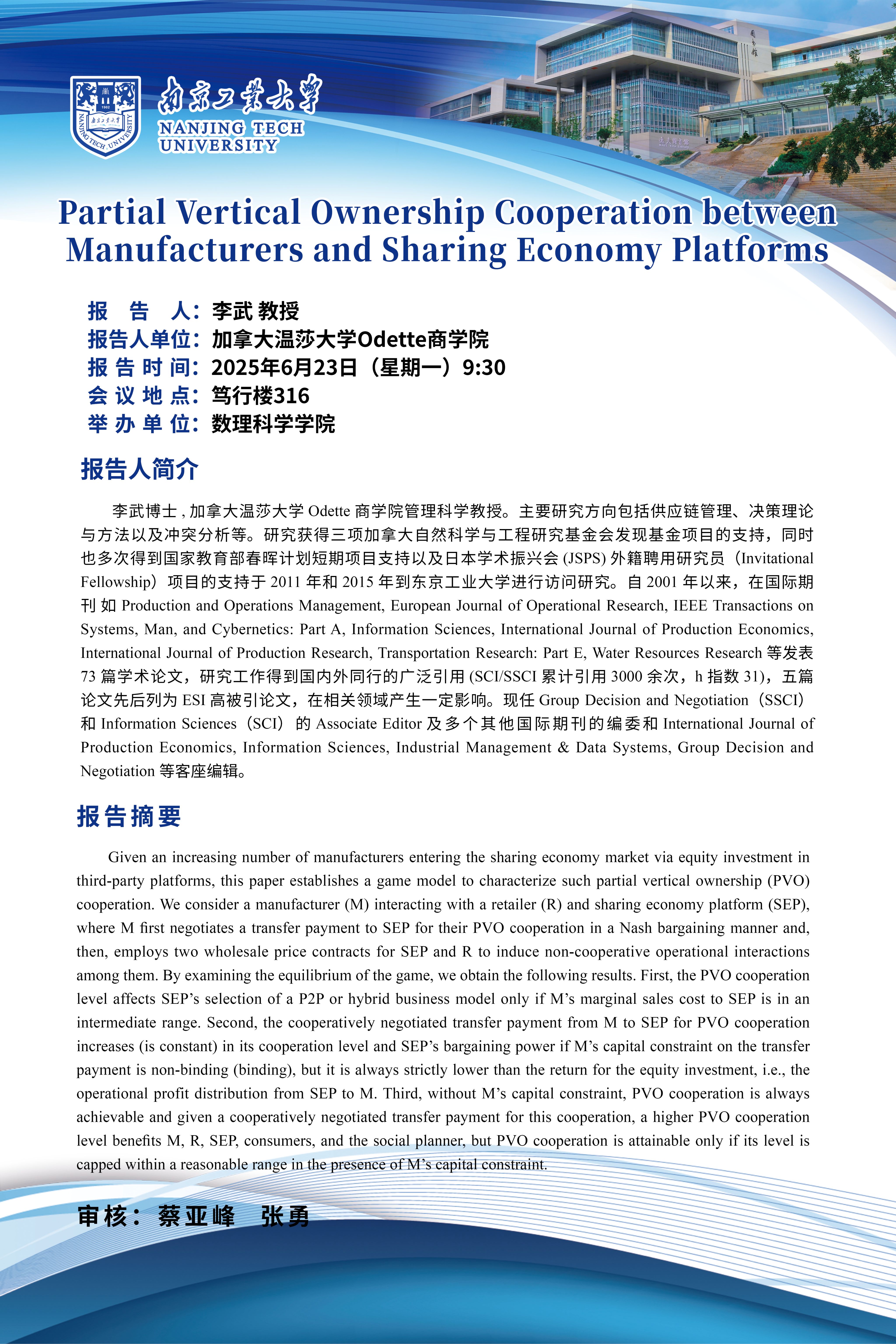 数理论坛第三十九期:加拿大温莎大学李武教授作学术报告