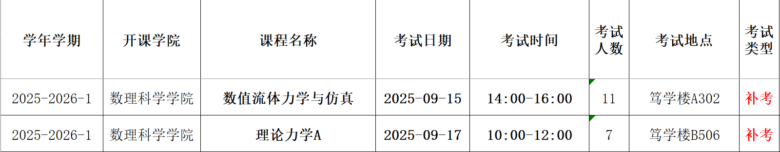 2025年秋季学期补(缓)考学院自排考试安排--力学系