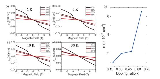 随着掺杂浓度的上升载流子浓度的变化,可以发现随着Sn元素的增加,样品的载流子浓度有所提升,从1×1020上升到了6.5×1020cm-3,证明了样品的费米能级发生了明显的移动。磁性和输运测量都说明了Sn对MnBi2Te4材料体系的影响,值得注意的是Sn的掺杂降低MnBi2Te4样品本身的反铁磁到铁磁的转变需要的磁场,为以后进一步的实现更低磁场的Chern绝缘体态做了铺垫。
