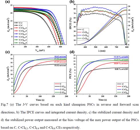本课题组在碳基介观钙钛矿太阳能电池中引入了一种简单低成本的溶液法对碳电极的主要成分石墨进行氯表面改性,并将氯掺杂石墨(C-Clx,x=0.2,0.4,0.6)应用于基于TiO2/ZrO2/(5-AVA)x(MA)1-xPbI3/C-Clx结构的印刷C-PSCs中的对电极。实验结果表明,C-Clx(x=0.2,0.4,0.6)能有效地提高C-PSCs的效率。C-Cl0.4电极介孔PSCs的平均效率为11.81%,是C电极介孔PSCs的1.46倍,短路电流密度(Jsc)、填充因子(FF)和开路电压(Voc)分别提高了15.8%、11.7%和11.2%。同时,30天的老化试验表明,基于(5-AVA)x(MA)1-xPbI3和C-Clx电极的PSCs在环境空气条件下具有良好的稳定性。