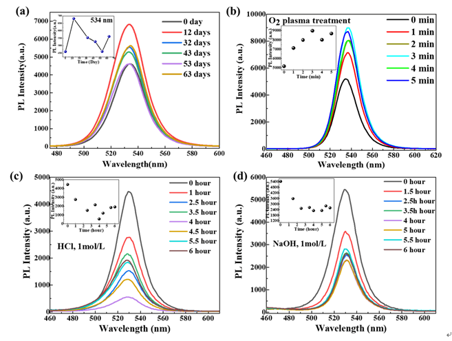 Figure 2. (a) PL intensity evolution of CH3NH3PbBr3 nanocrystals film in the air at room temperature. (b) The O2 plasma treatment test of luminescent CH3NH3PbBr3 nanocrystals film. (c, d) The resistance of luminescent CH3NH3PbBr3 nanocrystals film within 1mol/L aqueous acid and alkali solution.