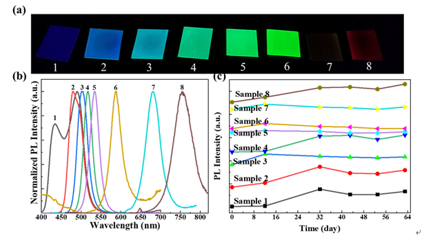 Figure 1.(a), (b) the fluorescence images and PL spectra of as-prepared multi-colour CH3NH3-halide perovskites under 365 nm lamp excitation. (c) The air resistance test of photoluminescent MAPbX3 at room temperature.