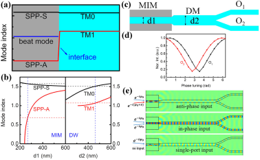 Figure.1 (a) Assumption of mode properties of two cascaded waveguide systems, which can possibly satisfy the requirements of synchronous interference and directional coupling function. (b) Mode curves of MIM waveguide and DW as a function of center dielectric-layer thickness. (c) Schematics of lossy nonunitary BS. (d) Simulated synchronous interference results. e The field distributions of interferences in the conditions of the anti-phase, in-phase, and the singe-input cases (Color figure online).