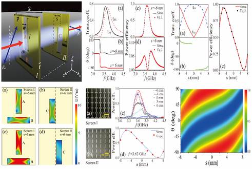 近来,公司的研究生张仕钱同学基于人工材料提出一种可动态调控的偏振波干涉系统,从而将偏振光干涉效应从光频段扩展到微波段。理论和实验研究中所采用的人工结构为两块刻有亚波长小孔的、间距远小于电磁波长的金属片:一块相当于超薄的双折射波片,将入射波分解成两个正交的偏振分量;另一块相当于一个超薄的线偏振片。由于近场耦合效应,两个正交的偏振分量能够产生有效的透射并进行干涉。研究发现,两个偏振分量的透射系数和相位差依赖于两个穿孔金属片的近场耦合效应。通过机械调制(或利用MEMS系统进行实时调制)该系统内部的横向位移,近场耦合效应、透射系数与相位差、偏振波干涉等可实现高效的动态调控。该系统克服了对自然材料微弱的双折射效应的依赖且系统厚度远小于电磁波长,可用于构造亚波长的微波或太赫兹开关、调制器等。