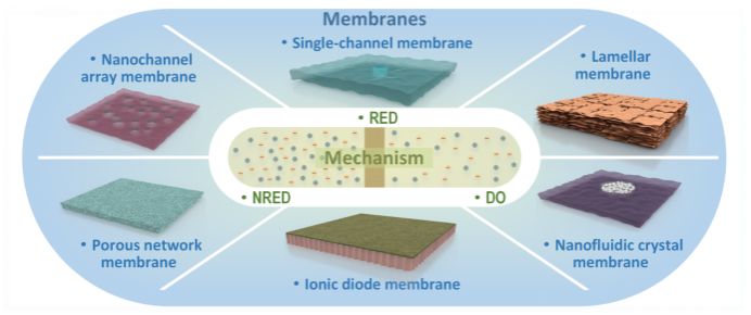 72779太阳集团焦艳梅副教授联合南洋理工大学Yang Chun教授、西安交通大学王秋旺教授、西安交通大学赵存陆教授首先对MDOPG的三大分支(反向电渗析、纳米流体反向电渗析和扩散-渗透技术)进行深入剖析,通过分析其能量转化中离子与膜内纳米通道之间的相互作用关系首次阐明了三大分支的能量转化机理的一致性。基于此项发现,作者系统梳理了目前用于直接盐差能能量转化的所有纳米膜材料,根据其结构特性创新性提出了一个科学全面的纳米膜材料分类方案,并深入厘清了纳米膜材料的各项关键特性(包括结构特性、电化学特性、制备技术、优缺点、经济评价指标等)及其相互关系。与此同时,作者还展望了未来MDOPG研究中潜在的挑战(包括提高纳米膜材料的离子传输效率、纳米膜材料的规模化量产、直接盐差能能量转化潜在应用场景等)和相应解决方案。此综述文章从电化学科学、材料科学、电动力学、形态学、力学和经济学等不同角度对MDOPG进行了全面系统地归纳总结,并提出自己的评论观点,对MDOPG技术的发展和突破起到至关重要的推动作用。