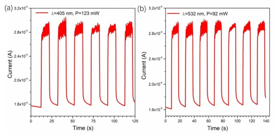 图2 偏置电压为3.0V,不同激光辐照下光电流随时间的变化关系,(a)波长为405 nm,功率为123 mW的激光辐照;(2)波长为532 nm,功率为92 mW的激光辐照。