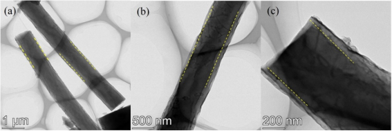 图1氩气氛围内热处理得到的V2O5/SnO2纳米纤维异质结构的透射电镜图片,其中黄色的虚线标出的是核壳结构的分界线,(a)低倍率下的TEM图片;(b)中等倍率下的TEM图片;(c)高倍率下的TEM图片。