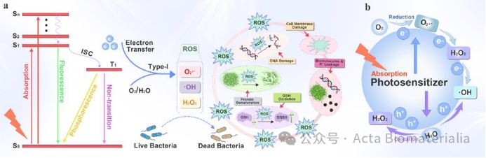 图1. Type-I 光动力疗法的基本原理、对细菌的作用机制以及形成各种类型活性氧物质时的电子转移过程。