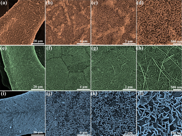 Figure 1 SEM images of samples with different magnifications, (a-d) SEM images of Bi nanosheets, (e-h) SEM images of Se nanowires, (i-l) SEM images of Se@Bi nanosheets.