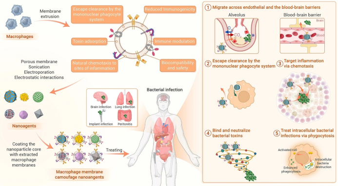 新型抗菌纳米剂凭借其独特的理化特性展现出广阔前景,但临床应用仍面临三大关键挑战:体内蛋白质冠形成、免疫系统快速清除机制以及深部感染靶向性不足(如肺炎、脑膜炎及植入物相关感染)。此类病灶中,病原体通过毒素释放、吞噬细胞内增殖及免疫逃逸三重机制建立生存优势。亟需能突破生理屏障、精准清除宿主细胞内及深部组织隐匿菌群的新型治疗策略。作为先天免疫核心组分,巨噬细胞具备三大生物学优势:①模式识别受体介导的病原体清除能力(如Toll样受体系统);②趋化因子受体(CCR2)与粘附分子(整合素/选择素)协同驱动的炎症靶向迁移能力,可突破内皮屏障甚至血脑屏障;③脂多糖等促炎因子内化功能,赋予其作为药物载体、免疫调节剂及感染治疗平台的独特价值。通过仿生工程策略,研究者构建出巨噬细胞膜包被的核壳纳米体系(MMCNs),其突破性优势体现在:免疫逃逸增强、病灶靶向精准化及药物递送智能化。