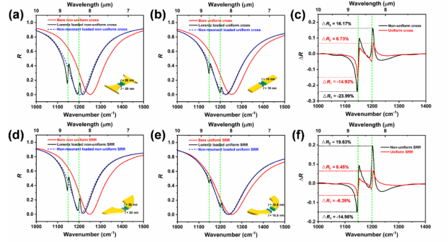 阅读次数: 发布时间:2025-09-25 更新时间:2025-09-25表面增强红外吸收(SEIRA)光谱是一种通过解析特征吸收指纹来鉴定生物分子组成的强大分析技术。等离激元纳米结构能将光场局域在纳米尺度的"热点"区域内,从而增强SEIRA信号,其增强能力主要取决于结构设计。本研究提出了一种非均匀共振单元设计策略,可显著提高场增强因子。以均匀十字纳米棒和开环共振器(SRR)作为参照结构,数值模拟与实验研究均证实非均匀设计优于传统均匀结构。为评估SEIRA性能,将具有1100 cm⁻¹至1400 cm⁻¹多吸收带的PEO聚合物作为分析物沉积在制备的谐振器阵列上。实验表明:非均匀十字纳米棒相较于均匀结构的SEIRA信号提升达64%;非均匀开环共振器相较于均匀结构的信号提升高达210%。所提出的非均匀设计聚焦于共振器"冷区"的结构优化,不仅适用于SEIRA技术,也对其他红外光子器件具有借鉴意义。