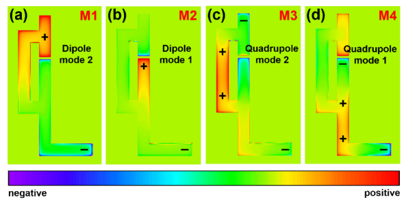 本文报道了一种可同时支持偶极与四极等离激元模式的四波段超表面吸收体。这种独特结构在中红外光谱范围内产生了四个强度均匀的吸收带。模拟结果证实,四种共振模式在设计纳米间隙处呈现空间重叠的"热点",确保多波段SEIRA增强探测作用于同一批分子。以PMMA和CO₂的多个振动带作为光谱探针,表征了四种共振模式的增强能力。