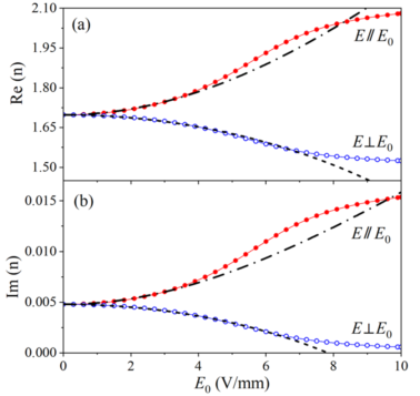 针对这一挑战,我们理论提出了一种基于金属纳米棒悬浮液的设计方案,揭示了一种太赫兹波段的“巨电光效应”。方案采用微米级长度、数十纳米级半径的金属棒作为功能单元,将其分散在非极性液体中形成“等离激元悬浮液”。该材料实现“巨电光效应”的物理机制源于两个数量级上的巨大提升。首先,是静态极化能力的百万倍增强。金属纳米棒本身虽无固有偶极矩,但在外加静电场作用下,其内部大量自由电子会发生定向移动,在棒的两端累积电荷,从而感应产生静态偶极矩。计算发现,这种微米级银纳米棒产生的感应偶极矩可高达约10⁻²⁴ C·m,比典型的极性分子的固有偶极矩(约10⁻³⁰ C·m)提高了6个数量级。这意味着,即使施加非常微弱的静电场,所产生的扭矩也足以克服热运动的影响,使纳米棒高效地沿电场方向定向排列。其次,是太赫兹光学响应的亿万倍增强。由于微米级的长度设计,这些金属纳米棒会在太赫兹频段产生强烈的等离激元共振。即使在共振频率之外,其太赫兹光学极化率也达到了惊人的10⁻¹⁷ m³,这比普通分子的电子极化率(10⁻²⁹ m³)高出12个数量级。这种极强的光学响应意味着纳米棒的取向将极大地影响悬浮液整体(有效媒质)对太赫兹光的介电常数或折射率。理论计算表明,对于一定的浓度范围,该材料在仅为10 V/mm的电场下,即可实现高达0.06~1.0的折射率变化(相对变化4%~56%),且折射率的虚部远小于实部(即具有微弱的吸收;工作频率需偏离等离激元共振)。此外,该材料还伴随着强烈的双折射效应以及(靠近共振波长处的)电吸收效应。