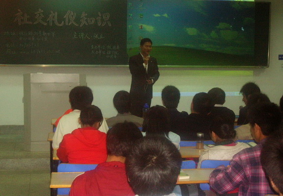 为了培养老员工的基本素养,帮助老员工与他人建立良好的人际关系,促进老员工的身心健康,由校团委主办,理学院分团委承办“社交礼仪知识”讲座于2008年3月27日在浦江学院教学楼A202举办。本次讲座的主讲人是毕业于南京大学的张立老师,他是南京斯坦福教育中心首席顾问,张老师为我们对最新动态礼仪知识做详细介绍,给了同学们很大的帮助。