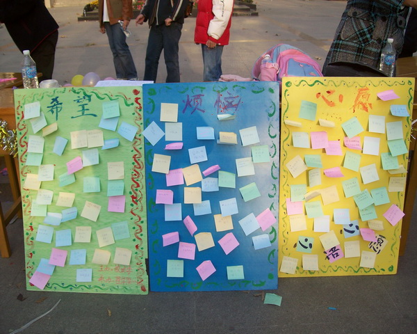 同时,作为本次活动的主题之一,我们准备了许多的小贴纸供同学们书写下自己的美好心愿、对他人的祝福以及自己目前学习生活中的困扰烦恼,我们将写好的贴纸贴于相应的展板上供同学们互相交流。与此同时,我们的工作人员抓紧时间进行了老员工心理压力的问卷调查活动。问题涉及了老员工英语四、六级,考研,找工作,出国留学等现今老员工比较关注的热点问题,此次问卷为我们的心理宣传周取得了宝贵的数据资料。