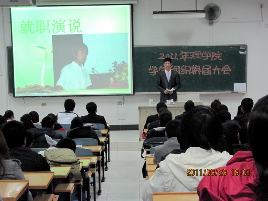 阅读次数: 发布时间:2011-04-02 更新时间:2018-12-073月23日晚六点,2011年员工组织换届大会在厚学601隆重举行。理学院员工工作办公室主任夏玚玚、分团委书记杨瑾、分团委副书记崔锐博、魏文斌出席了大会,理学院员工会、科协、心协全体成员以及部分大一员工参加了本次大会。