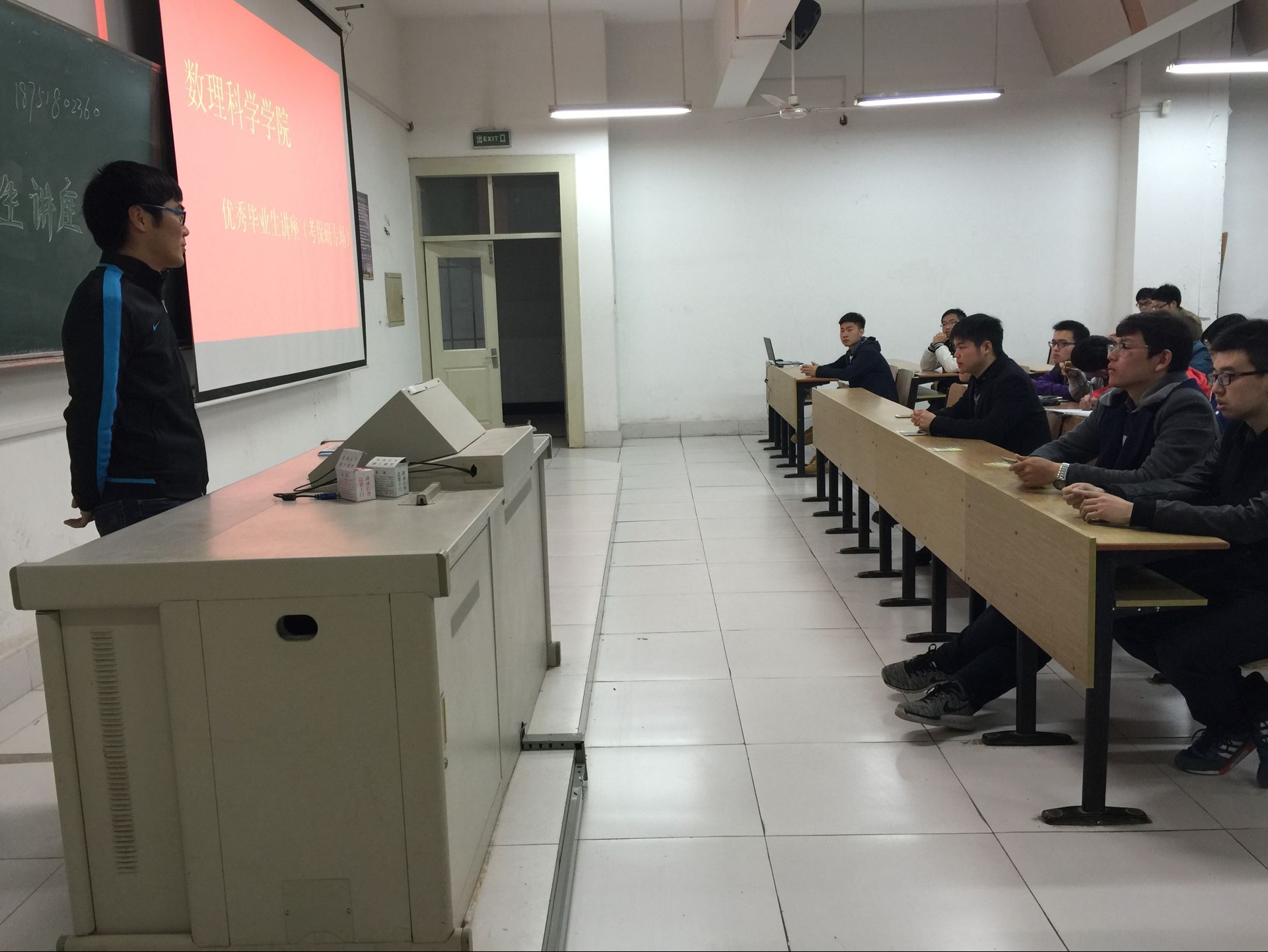 随后,来自12级应物专业的范艾杰同学讲述了自己的考研经历,告诉同学们要大胆制定目标,及时关注论坛,仔细分析考研视频,其中数学和英语都要坚持做题,政治也要及时复习,做到合理安排复习时间、认真规划复习重点。他告诉我们,只要坚持,就可以看到成功。吴玉明同学强调通过考研可以改变自己已有的坏习惯,从而形成良好的生活作息规律,乐观积极向上的面对自己以及未来的人生!之后作交流的王余成同学,不仅传授给大家一些学习经验,还建议每位考研的同学找到一套属于自己且适合自己的学习方法。最后,已被东南大学录取的顾丹华同学在跨专业考研方面为大家进行答疑解惑。在场的同学进行了热情积极的互动,深刻探讨和交换了学习方法与技巧。
