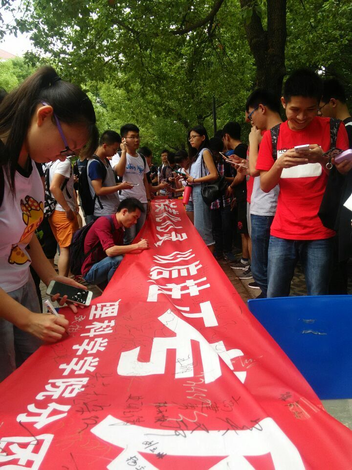 中午11点半,工作人员在东苑拉起了横幅。活动一开始,气氛就十分高涨。同学们纷纷停下脚步在诚信横幅上签下了自己的名字。12点下课后,人流高峰期到来,我们的活动获得了更多人的支持,每一次郑重的落笔都展现出他们对诚信考试的支持与重视。活动过程中,我们不时用相机记录下同学们签名的场景,那些身影是那么的积极踊跃、果敢坚定。