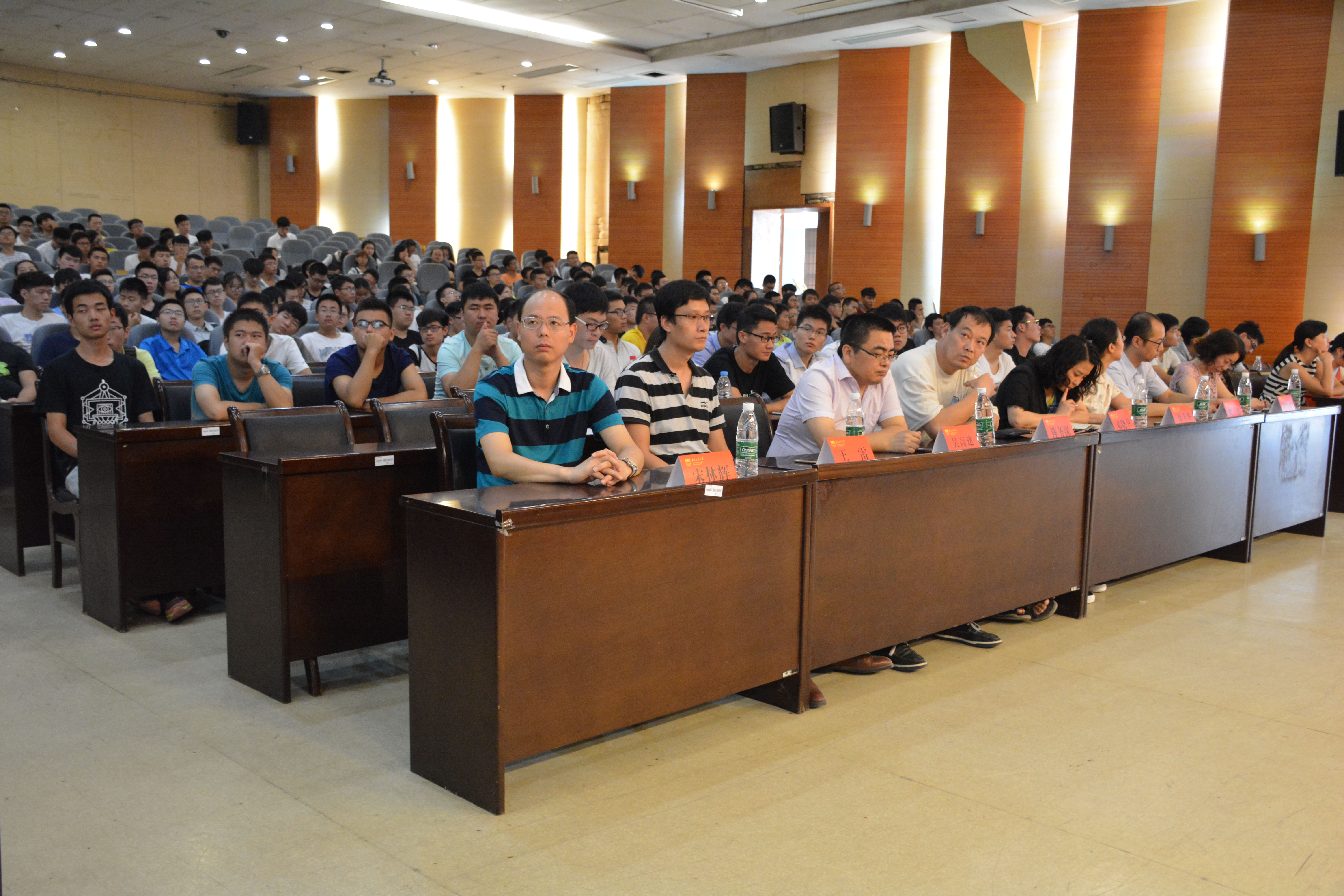 8点40分大会准时开始,首先,王超老师给大家介绍了到场的各位来宾,并对16级新生的到来致以最热烈的欢迎。接着,沈临江经理从学校简介、学院架构两方面对太阳集团和72779太阳集团的相关情况做了翔实生动的介绍,并且希望新生们以人为镜、取长补短,成为心智健全、内秉刚健、善于破疑立新的创新人才。随后,光电1402班的朱峰同学作为学长代表发言,他从自己的大学经验和收获出发,让新生们了解到机会不是从天而降,越努力才会越幸运。最后,张瑞荣书记致辞。张书记从“大学之大”开始讲起,鼓励同学们要志存高远、有所作为,在四年的大学时光里坐好规划,给自己的人生目标做个定位。