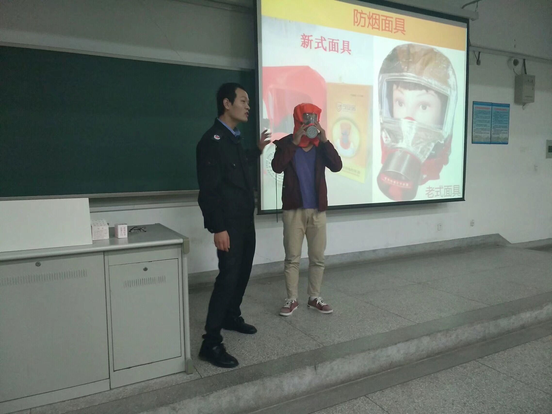 讲座一开始,余晓冰教员便向同学们列举典型的火灾案例,并播放了几个火灾视频。通过分析火灾成因,摆出具体的伤亡数据让同学们意识到火灾的严重危害性,他指出尽管同学们已经迈进大学校门,步入成年阶段,但防范意识依然薄弱,应急技能仍有待提升。为此主讲教员现场教授同学们遇到火灾时的几个自救小方法,并演示如何正确佩戴防烟面具,如何正确使用灭火器。生动的讲解让在场同学收获良多。最后,余晓冰教员强调,大学校园人群密集,是火灾易发地点之一,告诫同学们在宿舍生活中一定要做到人走电断以防危险,这既是对自己的负责,也是对他人的负责。