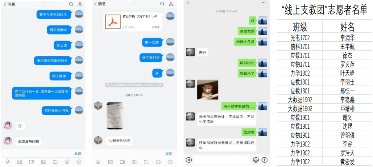 “思心一至,不闻雷霆”,疫情期间,在全国各级各类学校积极展开线上教育,倡议“停课不停学”的情况下,公司员工党员和入党积极分子在完成学校教学任务之余,也在后方尽己所能为疫情重灾区的同学和防疫一线工作者的家人做贡献。员工党员信科(嵌入)1602班纪祥灏、应物1602班汪恒宇和同一年级身在湖北的同学积极进行线上交流,帮助同学备战考研复试。入党积极分子应物1601班雷鸣同学疫情期间在家通过小区业主群和父母微信接触到两个社区工作人员的子女,帮助他们分别辅导高一和高二的物理课程。此外,在院员工会牵头带领下,共组织15名党员和入党积极分子志愿者参与到“与抗疫一线医护人员家庭手拉手专项志愿服务”活动之中,积极组建“线上支教团”,依托数理学院学科特色,为他们提供数学、物理等科目的线上免费辅导,在巩固孩子们课内知识的学习之余,运用自身所学,开拓他们对数学、物理的认知水平,培养探索兴趣,陪伴他们一同成长,积极助力战“疫”。与此同时,公司本科生第一党支部和校研究生支教团工作者熊书晨对接,正积极开展面向贫困地区小员工线上学业帮扶活动。