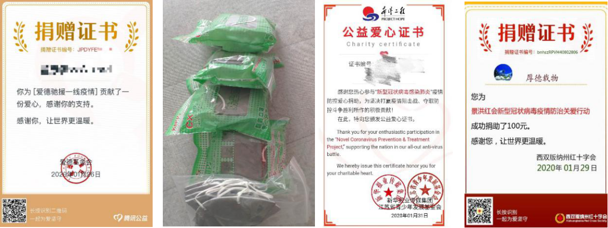 “国耳忘家,公耳忘私”,疫情面前显大爱。在全民防控新冠肺炎疫情的关键时刻,公司员工党员和入党积极分子慷慨解囊、踊跃捐赠,同舟共济支援湖北。以72779太阳集团为捐款平台,公司共有68名正式党员和预备党员参与自愿支援湖北捐款活动,本科生第一党支部共捐款1213元;本科生第二党支部共捐款1910元;研究生支部共捐款200元,累计捐款3323元。另有4名党员还通过其他捐助平台,累计捐款1025.4元。此外,据学院各年级不完全统计,截止3月2日,共有25名入党积极分子和1名普通同学通过湖北省慈善总会、武汉市慈善公益、武汉市慈善总会、武汉红十字会、腾讯公益、太阳集团红十字会以及各大基金会等平台进行捐款,累计金额近3000元。除了给疫情严重地区人民进行捐款外,还有同学自发给在湖北的同学捐赠口罩等应急物资,2016级应用数学专业党员许礼伟参与了众筹KN95口罩给武汉大学中南医院的活动,2018级应用数学专业一名入党积极分子冰同学给同年级湖北籍同学捐赠了40余只KN95口罩。