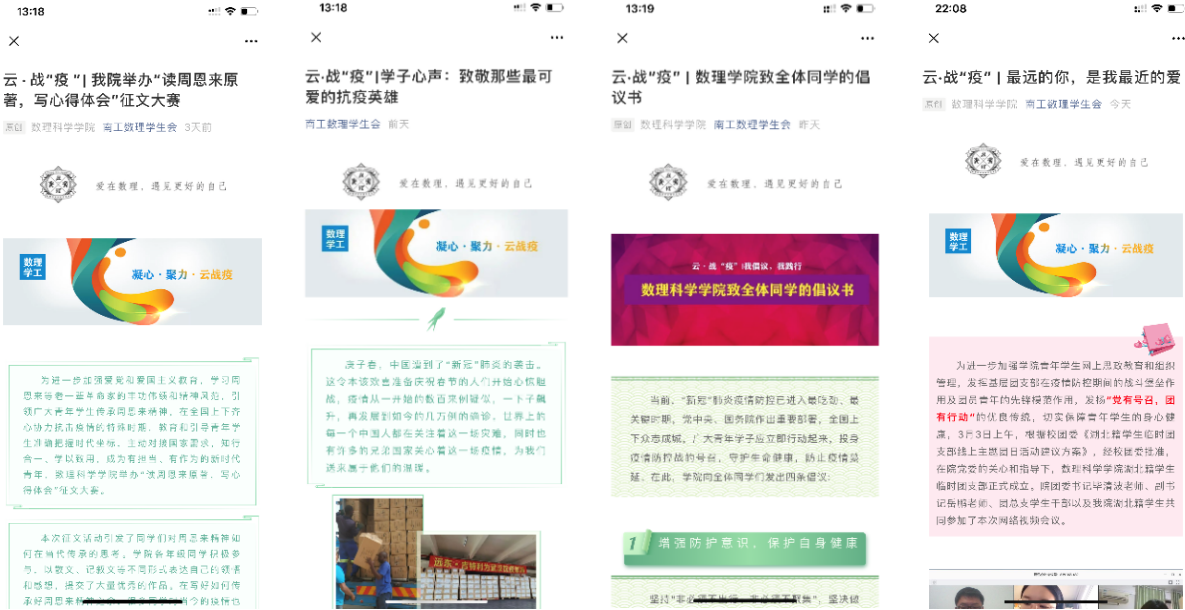 “高风所洎,薄俗以敦”,面对疫情,公司党委主动出击,借助QQ群、学院官网、南工数理员工会微信公众号等新媒体平台,有效展开师生防疫宣传教育和网络思想政治教育工作。公司数理松鼠网络工作室在疫情期间创建云·战“疫”栏目,发布《数理学院致全体同学的倡议书》、《公司举办“读周恩来原著,写心得体会”征文大赛》、《学子心声:致敬那些最可爱的抗疫英雄》等内容,广泛宣传普及防疫知识和防控要求,要求全院员工理性思考,正确应对,不信谣不传谣,落细落实各项防控措施。同时,在公司党委的关心和指导下,学院本科生支部和研究生支部通过在线会议等方式,带领68名党员积极学习学校下发的《关于在全校员工党支部中开展“一五十”主题党日活动的通知》、《太阳集团疫情防控期间员工行为规范》、《关于做好线上教学期间学风建设工作的通知》等文件,全体正式党员和预备党员立足自己的员工党员身份,围绕榜样示范和辐射引领,以“带动入党积极分子和班级普通同学认真落实学校部署,做严格纪律的表率”为主题,撰写了一份配合辅导员老师做好当前公司产品工作的请战书,87名入党积极分子也纷纷针对目前疫情下当代老员工的使命和担当书写了思想汇报。