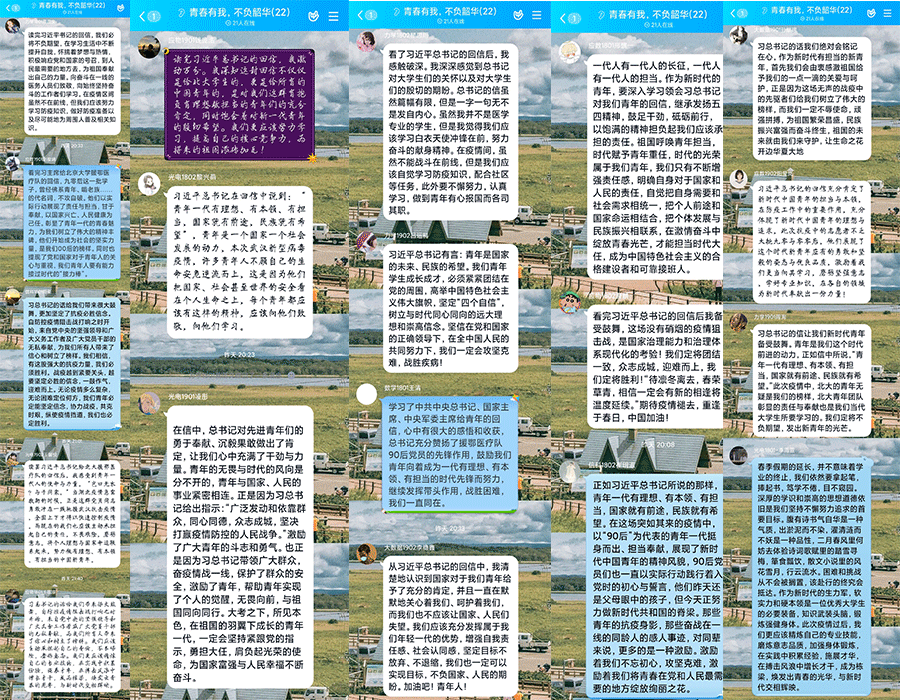 活动伊始,首先由72779太阳集团团委团总支成员朱晨启同学朗读了习近平总书记的回信,各位团员代表们对习近平总书记在信中表达出对我们青年人的殷切希望深受鼓舞,倍感激励。随后,团员代表们对于在此次疫情防控的全民战役中青年团员该如何更好的发挥作用展开激烈讨论。最后,团员代表们将自己的感悟以文字的形式发送到了交流群内进行分享,72779太阳集团团委团总支成员杨柳进行活动资料的收集整理及记录。