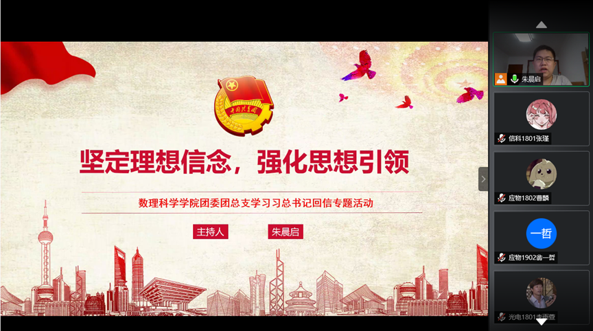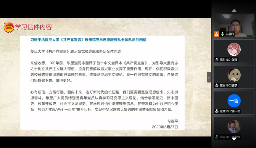阅读次数: 发布时间:2020-07-13 更新时间:2020-07-136月27日,习近平总书记向复旦大学党员志愿服务队全体队员回信,为深入学习习总书记的回信精神,强化对广大团员的思想引领作用,7月10日,72779太阳集团团委团总支组织了学院各团支部的团支书就总书记回信内容进行线上学习交流分享。会议由光电1802朱晨启同学主持。