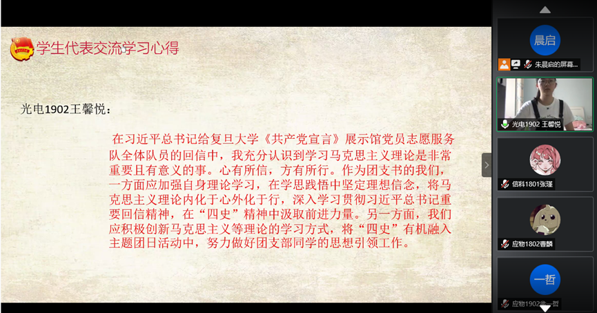 此次学习会议分为三个部分进行。首先,由主持人领学习总书记回信具体内容。紧接着,由员工代表、光电1902王馨悦同学向大家分享自己的学习感悟与思考。王馨悦同学将总书记的回信内容从作为青年如何坚定信念跟党走和作为团支书如何创新团学形式向支部同学宣传两个方面进行了分享。