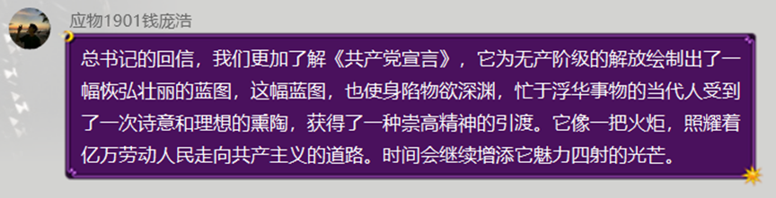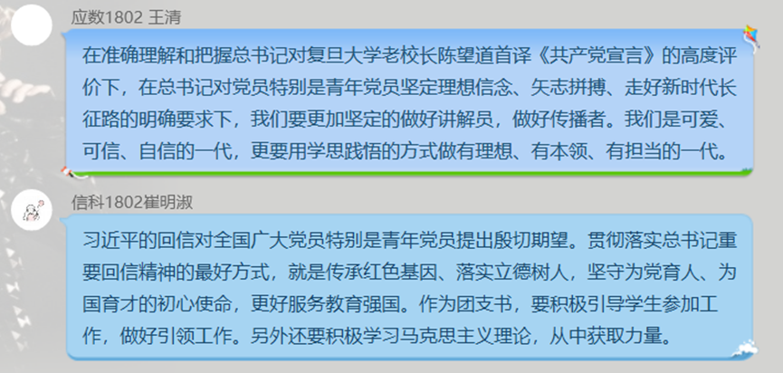 最后,各位同学在活动群内交流分享各自的学习心得,同学们积极探讨总书记对于我们广大青年的殷切嘱托和对于如何进行更有效的对马克思主义等先进思想进行学习和对同学们进行思想引领进行了积极地讨论。