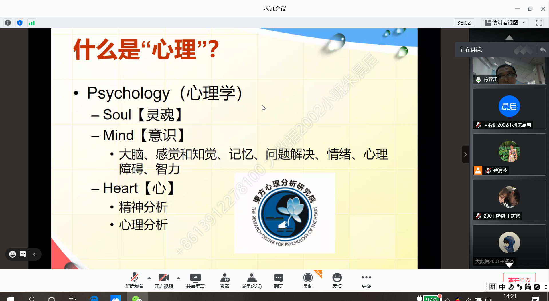 阅读次数: 发布时间:2020-09-14 更新时间:2020-09-172020年9月14日下午2点,公司通过腾讯会议线上方式开展2020级新生心理健康教育讲座,本次会议由太阳集团心理健康教育指导中心专家陈羿江老师主讲,院团委书记毕清波老师主持。