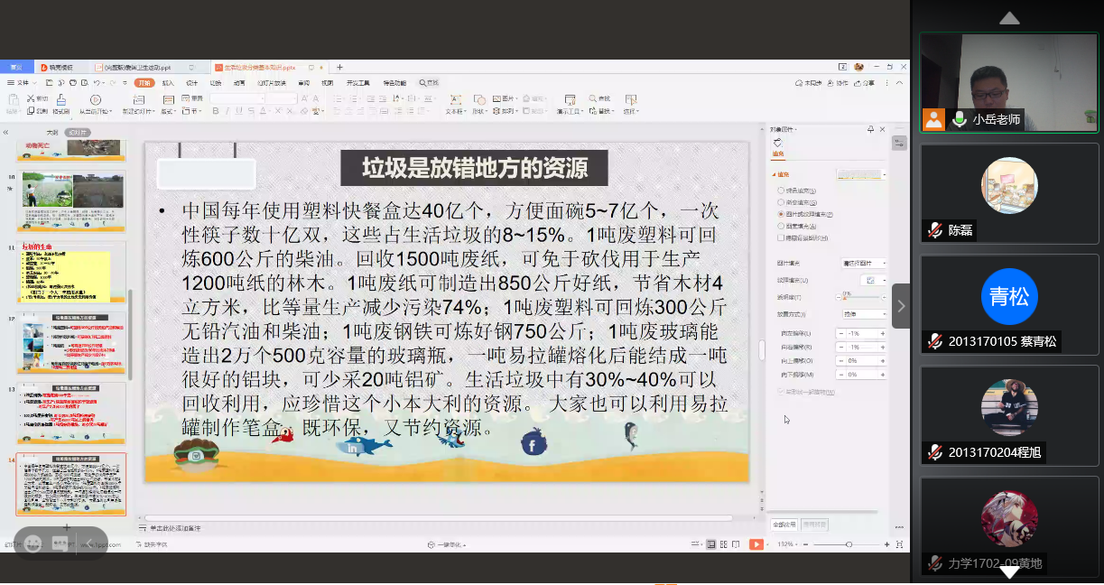 阅读次数: 发布时间:2020-09-20 更新时间:2020-09-28为进一步增强公司员工卫生保健意识,养成良好生活习惯,巩固疫情防控成果,助力文明校园建设,9月19日晚7点,公司线上开展垃圾分类知识小课堂,由学院团委副书记岳鹏老师主持主讲。