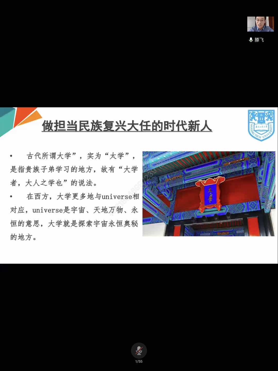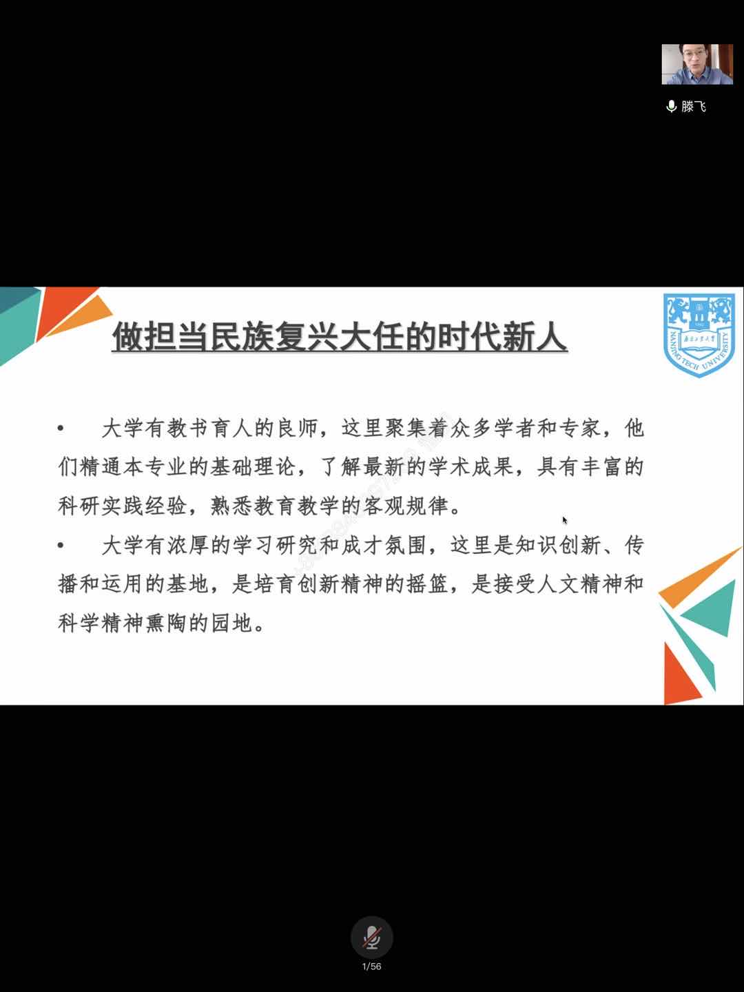 讲座伊始,滕老师向新生们解释了什么是大学、大学培养的是怎样的人、来到大学的目的,并强调在大学里不应当只沉醉于自然科学的学习,也应该加强人文科学的学习,增加自己的文化底蕴和内在修养。随后,滕老师从讲解新时代青年的特色出发,通过对比五四运动时期的新青年和当代新青年,启发同学们对大学做什么样的人、怎样做人、树立怎样的价值观等问题进行深入思考。明确了我们要做担当民族复兴大任的时代新人。最后,滕老师点明理想与信念内涵,解释了理想与空想的差别,强调理想从现实中产生,具有实践性,并以自己的亲身经历为例,让同学们对理想有一个更好的认识。演讲将近结束时,滕老师再一次向新生们介绍了太阳集团明德、厚学、沉毅、笃行的校训,并从自己的角度阐述了对于校训的理解,希望大家都能做好自己,迎接美好未来。