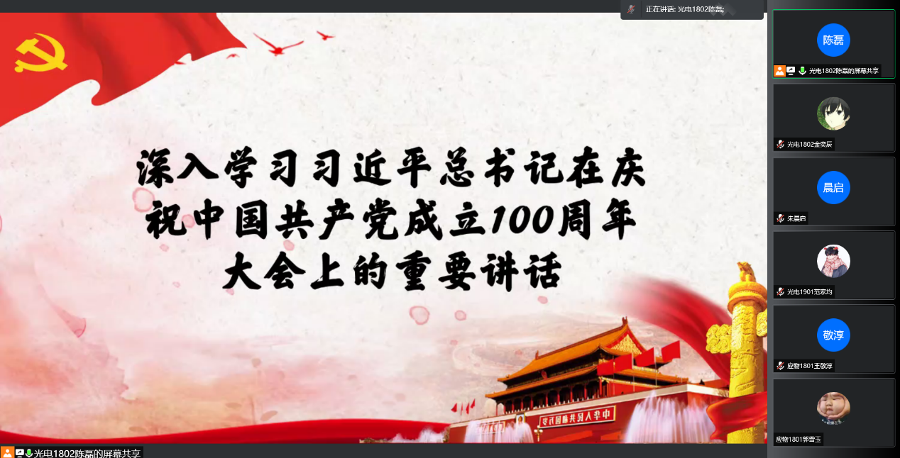 首先,蔡亚峰老师领学了《习近平总书记在庆祝中国共产党成立100周年大会上的重要讲话》,激励全体员工党员从学习中汲取前行力量,牢记九个“必须”,厚植家国情怀,不负时代、不负韶华、不负党和人民殷切希望,争做担当民族复兴大任的时代新人。随后,陈鑫、闫宇和杨柳同志从“学习有我”、“实践有我”、“创新有我”、“奉献有我”几个方面做重点发言。与会其他成员也积极分享了自己的学习感悟和实践心得。最后,支部书记陈磊希望同学们将“请党放心,强国有我”的铮铮誓言转化为实际行动,将“小我”融入“大我”,与党和国家、与民族和人民同呼吸、共命运,在拼搏中释放激情、追逐理想,在做好每一件小事、完成每一项任务、履行每一项职责中诠释责任担当,为中华民族伟大复兴作出自己的贡献。