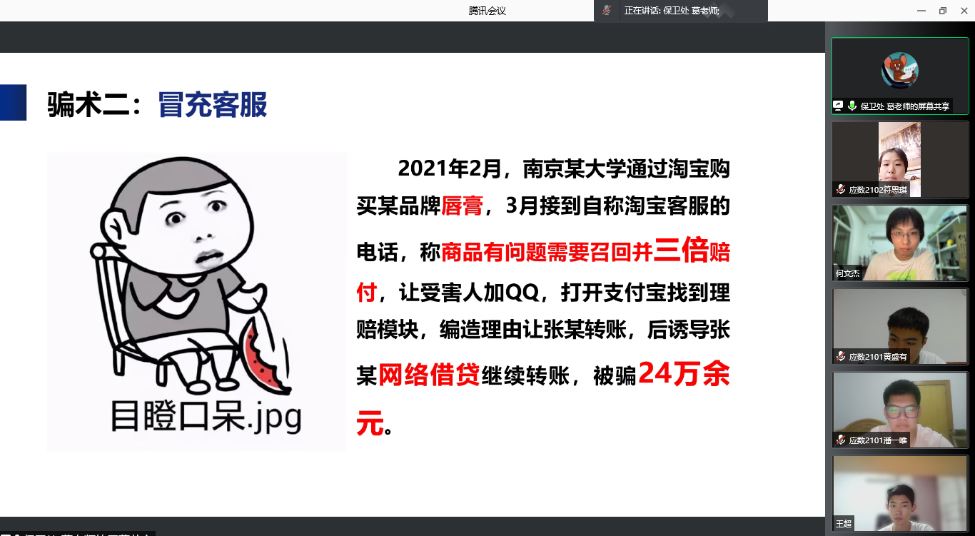 阅读次数: 发布时间:2021-09-25 更新时间:2021-09-25为提升公司2021级新生的安全意识,提升自我保护能力,创建平安校园,9月24日晚7时,72779太阳集团通过腾讯会议开展了面向全体2021级新生的线上校园安全教育讲座。本次讲座邀请校保卫处葛凯老师主讲,2021级新生辅导员杨德旭老师主持。