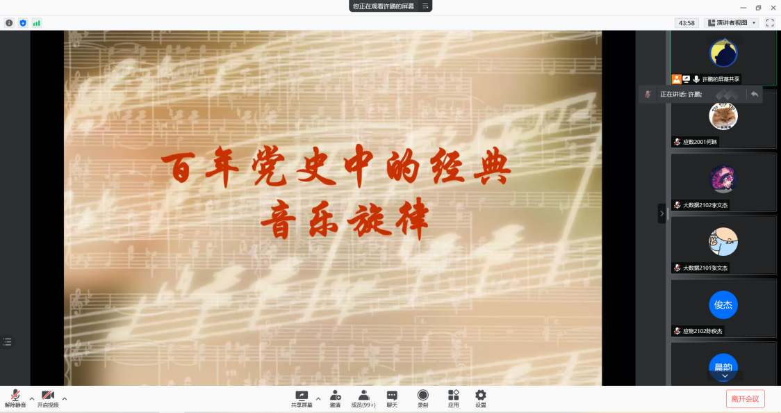 会议最后,许老师为我们讲述了《义勇军进行曲》、《黄河大合唱》、《红旗颂》等革命歌曲的创作背景,慷慨激昂的旋律,激励着数理青年奋发向上,争做时代新人。