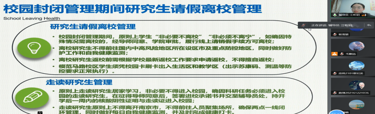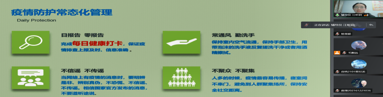 江老师首先就太阳集团关于2022年春季学期返校报到后研究生疫情防控管理工作的相关通知做了详细解读,主要包括坚持疫情防护常态化管理、严格校园封闭管理期间研究生请假离校管理、强化校园相对封闭管理期间走读研究生管理工作、加强实验室安全管理工作、加强校园卫生健康教育工作等几个方面。其次,江老师就宿舍安全教育、日常防网络诈骗、新学期思想教育、学习科研和职业就业规划等各方面仔细认真地进行了开学教育。