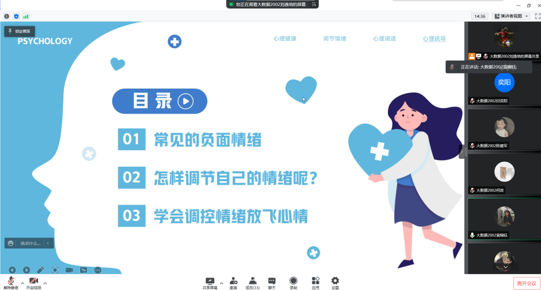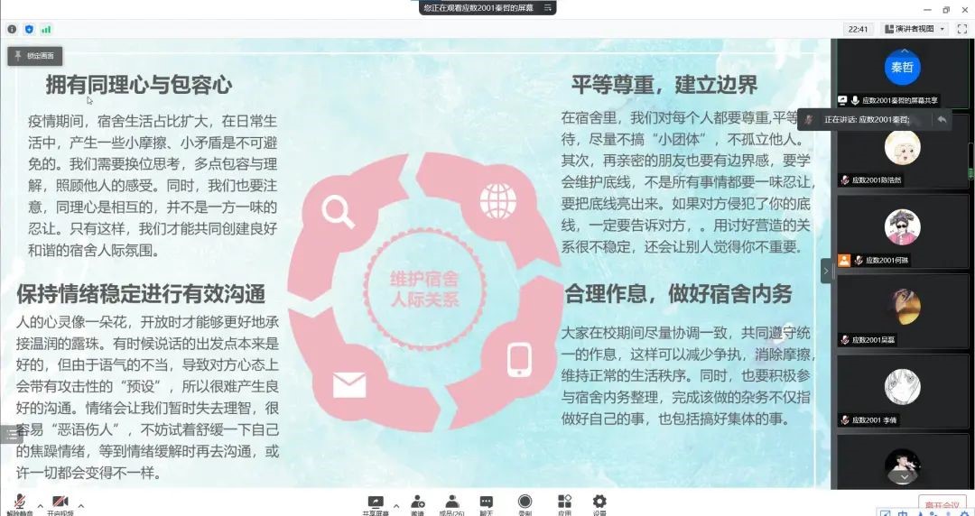 本次活动分为三个环节,首先由各班心理委员以生动活泼、寓教于乐的方式带领同学们学习心理健康知识,让更多同学对心理健康知识有更深层次的了解。其次,各班心理委员组织员工们共同观看心理励志视频,引发同学们的思考,与此同时,还提供了一些可以有效调节同学们的情绪与压力的方法,从而帮助同学们释放压力,放松身心。最后,各班级心理委员集中线下汇报展示同学们的学习成果,“心语昕约”心理工作室评选出学习成果很好的班级并予以褒奖。
