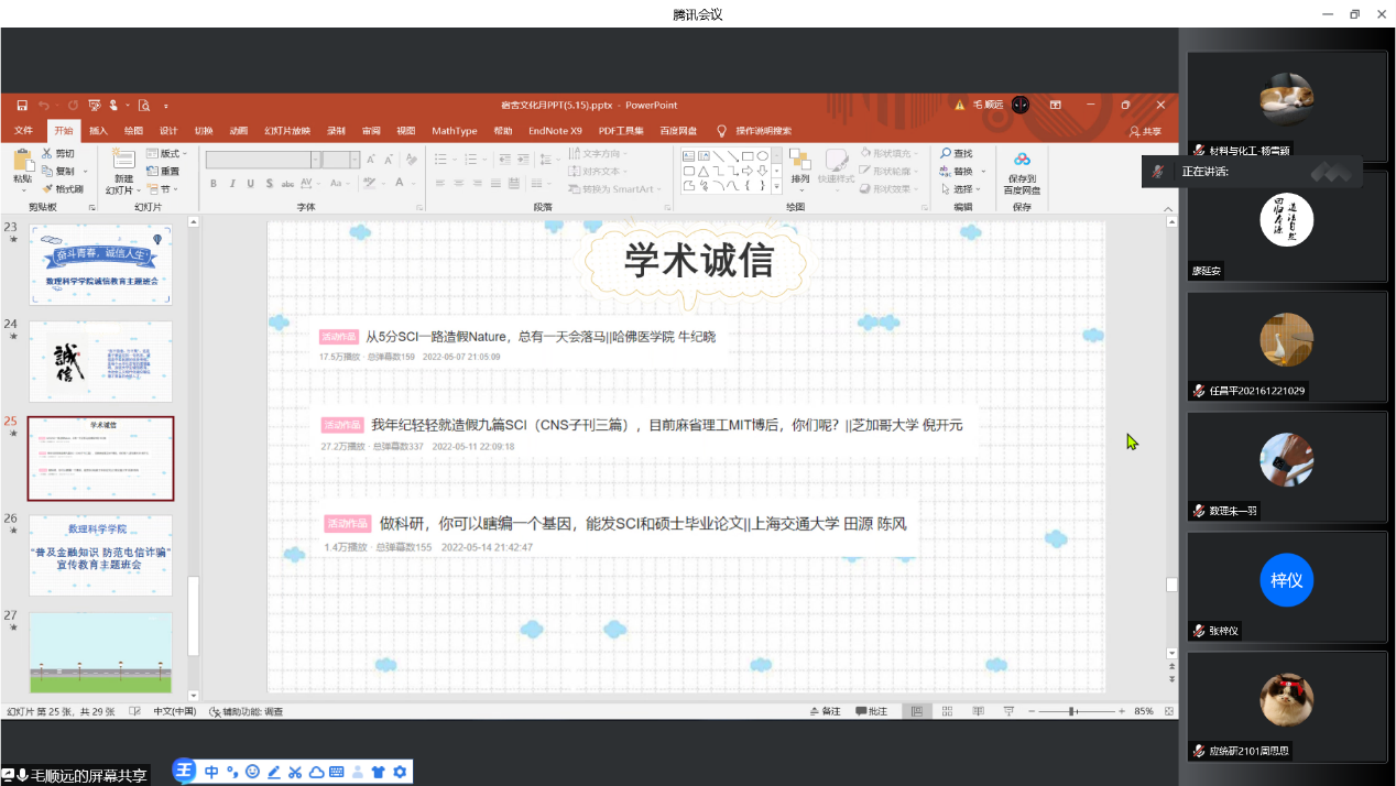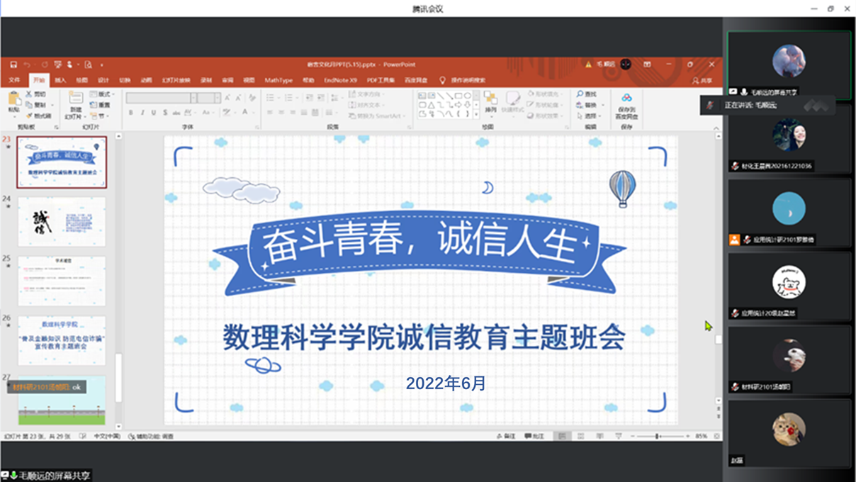 阅读次数: 发布时间:2022-06-20 更新时间:2022-06-20为贯彻落实立德树人的根本任务,践行诚实守信的高等教育重大使命,提高当代老员工的诚信意识,培养员工的诚信品质。6月10日晚上,72779太阳集团在线上开展了以“奋斗青春,诚信人生”为主题的研究生诚信教育主题会议。本次会议由院研究生会主席团成员毛顺远主持,研究生辅导员江昕玥和全体研究生参与本次活动。