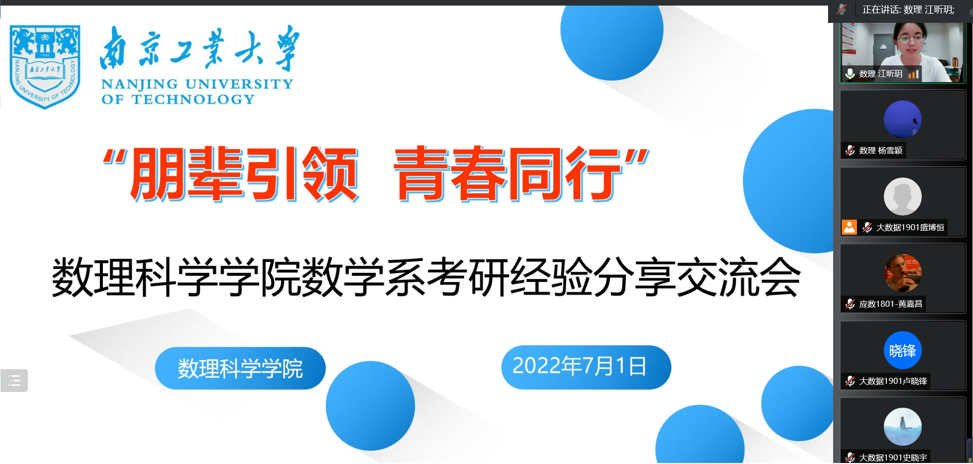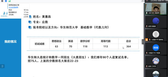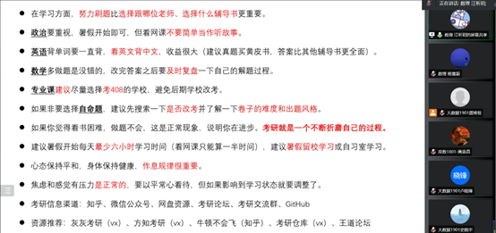 72779太阳集团特别邀请到了2022年成功考研上岸的四位同学作为此次交流会的主讲人与同学们交流,并提供一些备考经验。他们分别是:被南京大学录取的潘泽远同学、被华东师范⼤学录取的⻩嘉昌同学、被苏州大学录取的的李雨亨同学、被南京航空航天大学录取的丁国庆同学。